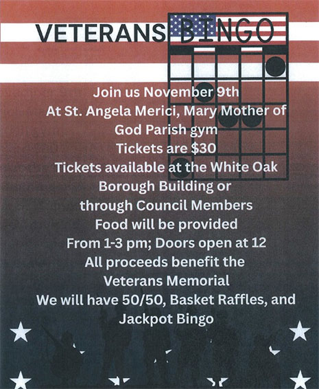 White Oak Borough Veteran`s MemorialWhite Oak Borough would like to honor all our veterans, as well as current military personnel by building a veteran’s memorial. The memorial will be located at Heritage Hill Park. Engraved bricks are being sold as an opportunity for our community to honor their military veteran or active-duty family members, friends and loved ones. The bricks will be included in the memorial as a long-lasting tribute. Two sizes will be available for purchase, a 4”x8” and an 8”x8” brick, along with an opportunity to purchase a 4”x4” replica coaster. Our Buy a Brick website will allow you to customize and purchase your brick for the memorial. All proceeds from the buy a brick campaign will go to the cost of building and maintaining the memorial. Thank you for supporting the White Oak Borough Veteran’s Memorial.